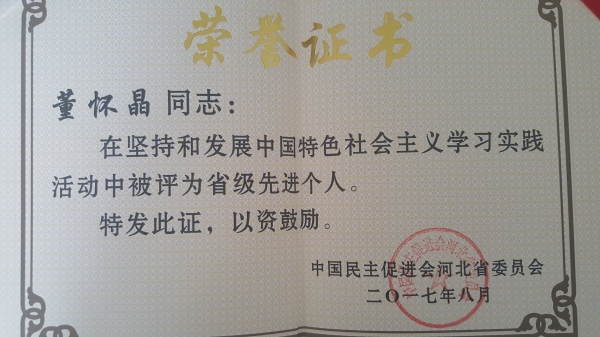 民进伟德国际1946源自英国二支部在开展坚持和发展中国特色社会主义学习实践活动中,被民进河北省委评为省级先进基层组织,美术系学工办主任、政协委员、民进伟德国际1946源自英国二支部副主任董怀晶老师被评为省级先进个人。