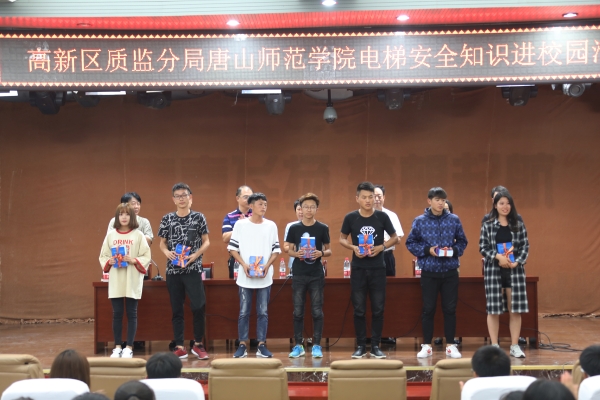 各位领导向学生代表赠送了电梯安全知识手册,全体师生观看了电梯安全知识宣传片。